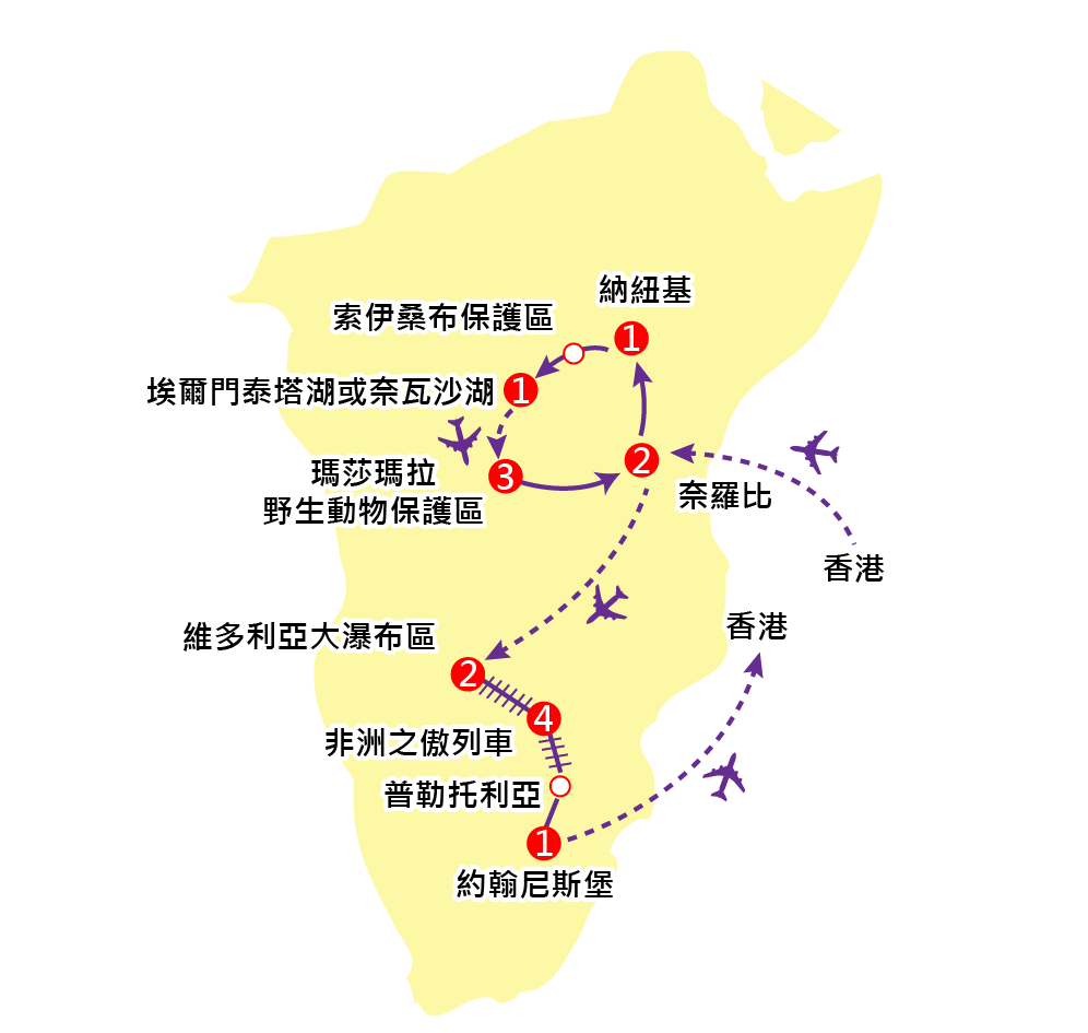 出發前一晚於香港國際機場集合,由翠明假期領隊陪同下,乘坐阿聯酋航空公司客機經杜拜轉機或卡塔爾航空公司客機經多哈轉機後飛往肯尼亞首都~奈羅比。