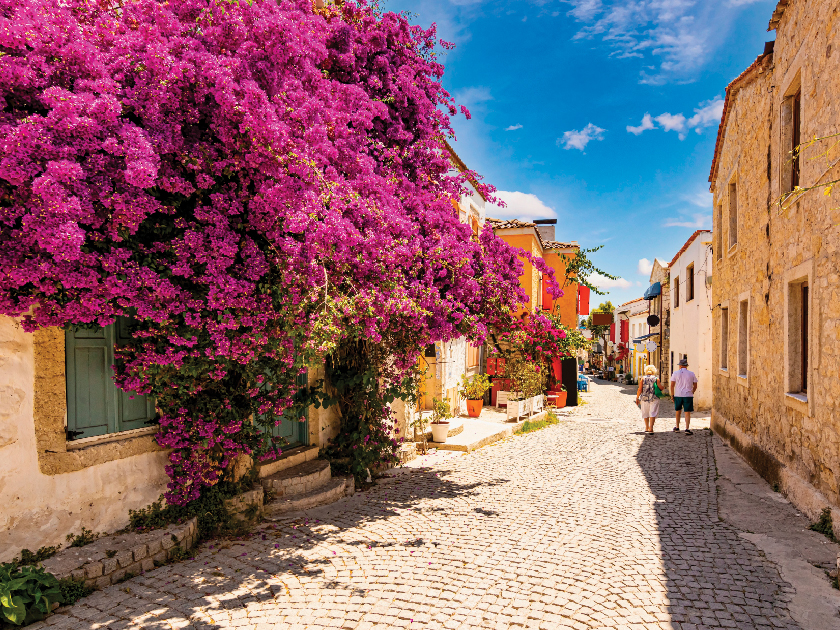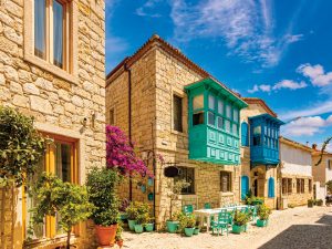 是一個迷人的小鎮,位於土耳其艾琴海岸,因其狹窄的街道、白色石頭房屋和藍色窗框而聞名。這裡曾經是一個重要的希臘港口,現在則以其獨特的風格和悠閒的氛圍吸引著遊客。現時是土耳其網紅景點,小小的街道充滿了異國情調,時而藍白色調的建築,時而浪漫的淡紫色建築,加上色彩繽紛的裝飾,讓每一個角落都充滿驚喜。