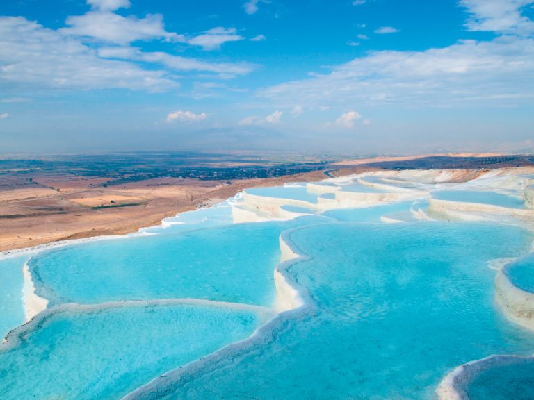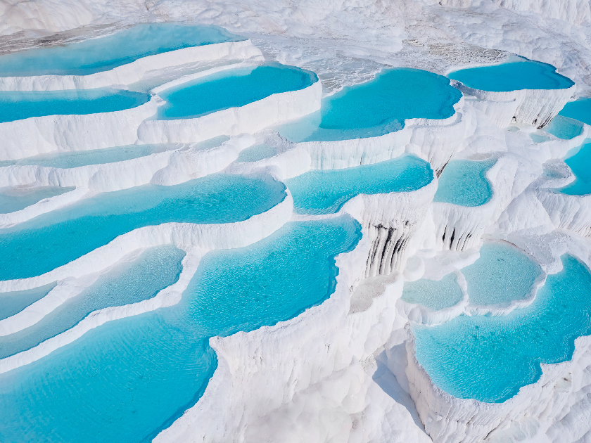 位於土耳其西南部,是一個以其獨特的白色石灰岩梯田而聞名的自然奇觀。這些梯田由於當地的熱泉水流經而形成,經年累月沉積的碳酸鈣使得這裡看起來如同一片雪白的棉花。棉花堡的名字恰如其分,意指「棉花的城堡」。這裡的溫泉水含有豐富的礦物質,對皮膚和健康有益,因此吸引了大量的遊客和療養者。