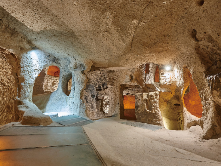 【凱馬克利地下城】在君士坦丁大帝將基督教列為國教之前,羅馬軍隊時常鎮壓基督教徒,當年許多虔誠的教徒、修道士紛紛地逃難至卡帕都斯亞,他們發現卡帕都斯亞的岩石非常適合挖鑿建屋,而這裡複雜的地形更適合躲避羅馬軍隊的追殺,於是他們在這裡定居,就地將岩石改造成住屋、教堂、修道院,並向下挖掘避難用的地下城市,到了西元七世紀,阿拉伯人入侵,基督教徒再度受到迫害,許多人跑到卡帕都斯亞地區躲避,到了十一世紀,卡帕都斯亞地區已經有超過一千個宗教性的建築存在。
