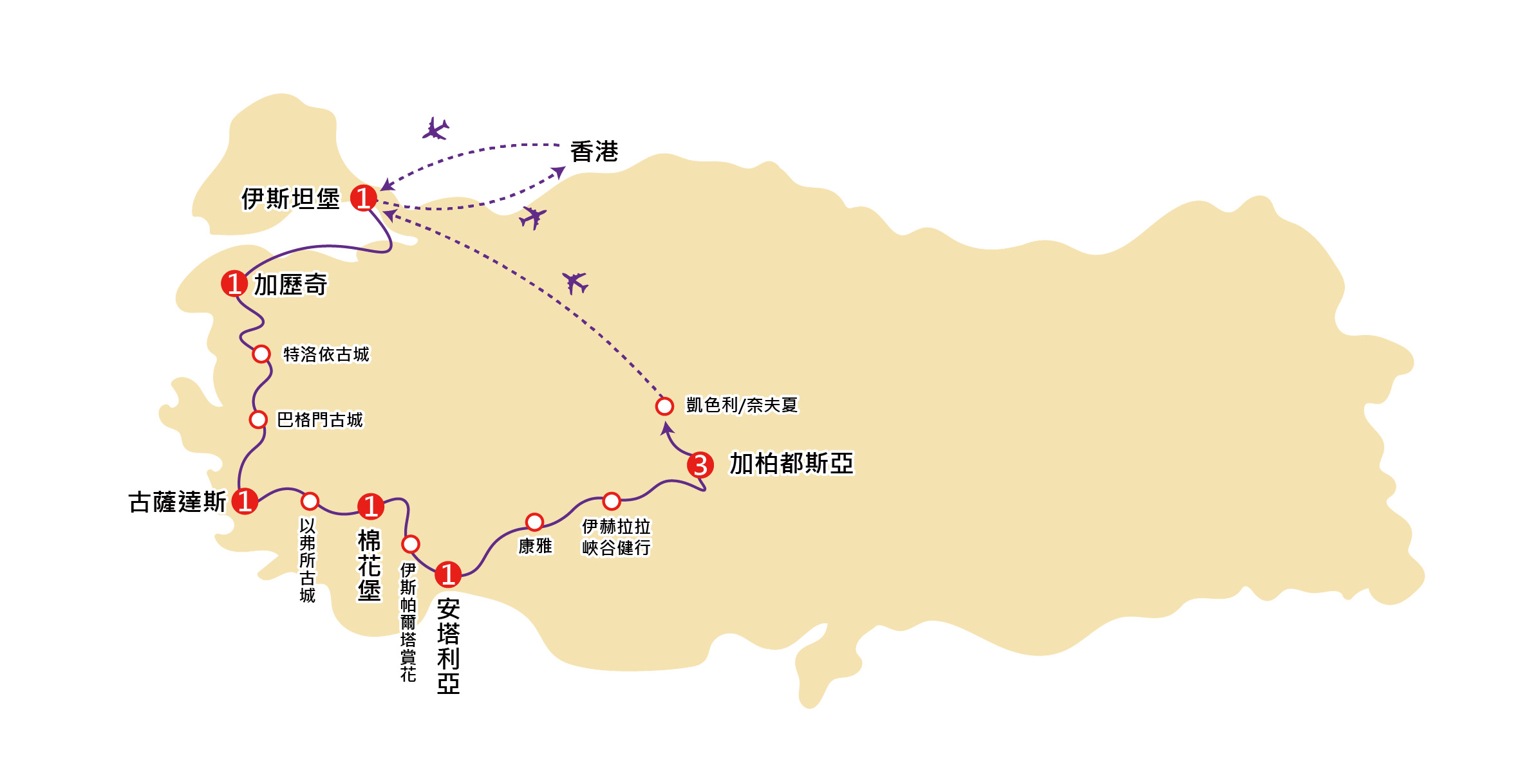 注意:伊斯帕爾塔賞花於春夏季節(4月中至5月中及6月中至8月底)有不同種類的花卉可欣賞,如櫻花、百合花以及薰衣草。不同月份可欣賞的花卉各異,敬請留意。若因氣候因素導致開花季節未逢盛開,敬請見諒。於非賞花時節,將安排前往安塔利亞古城遊覽,敬請留意。
