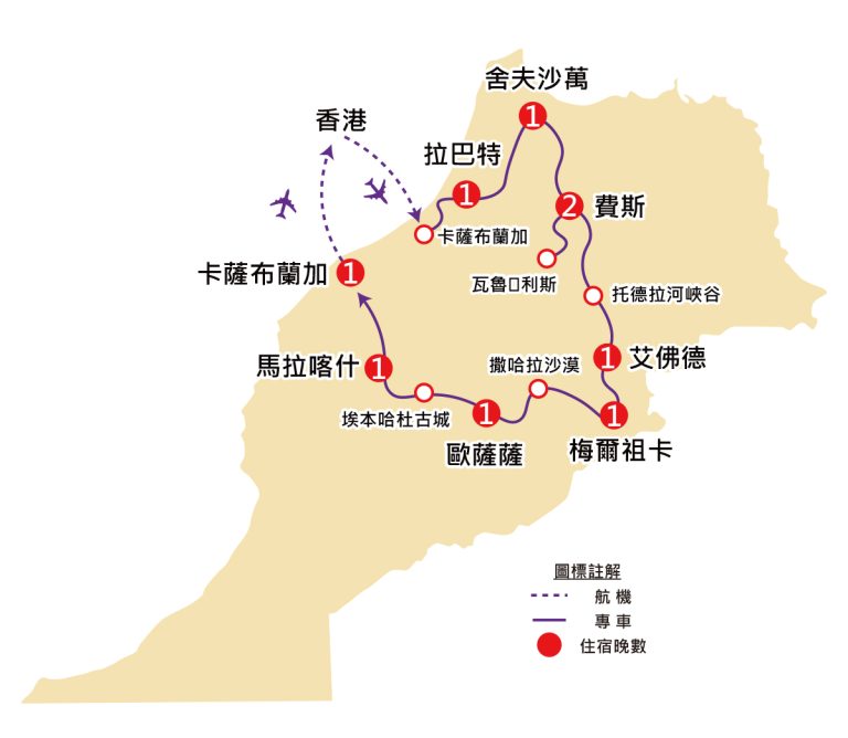 住宿:五星級 ADAM PARK 或 ATLAS MEDINA 或 同級酒店