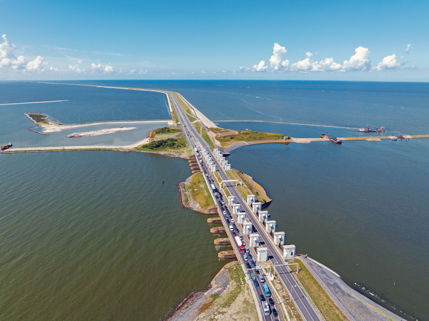 【大堤壩】被譽為「海上長城」,荷蘭人自古與水抗爭,隨著海平面不斷上升,便修建巨型屏障把海水擋住,希望從水災威脅中拯救荷蘭。堤壩落成後減輕了洪水對內陸的侵襲,但卻使環繞湖畔的漁村因此沒落。