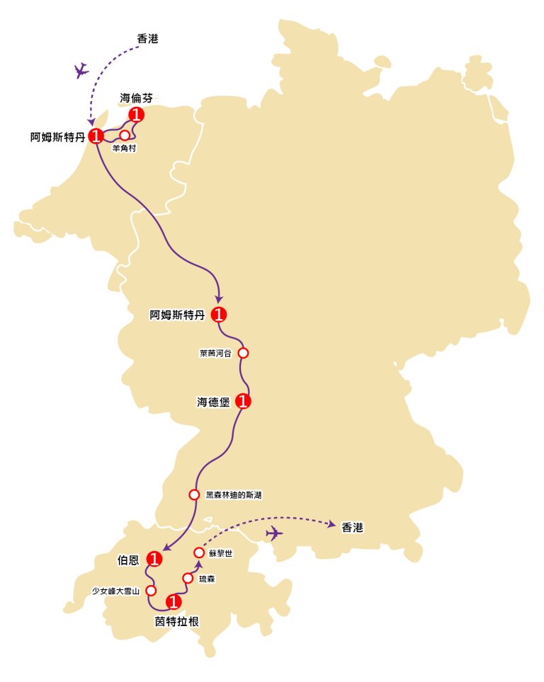 是日晚上由翠明假期領隊陪同下,乘坐歐洲或中東航空公司客機經歐洲或中東城市轉機飛往前往荷蘭首都阿姆斯特丹。