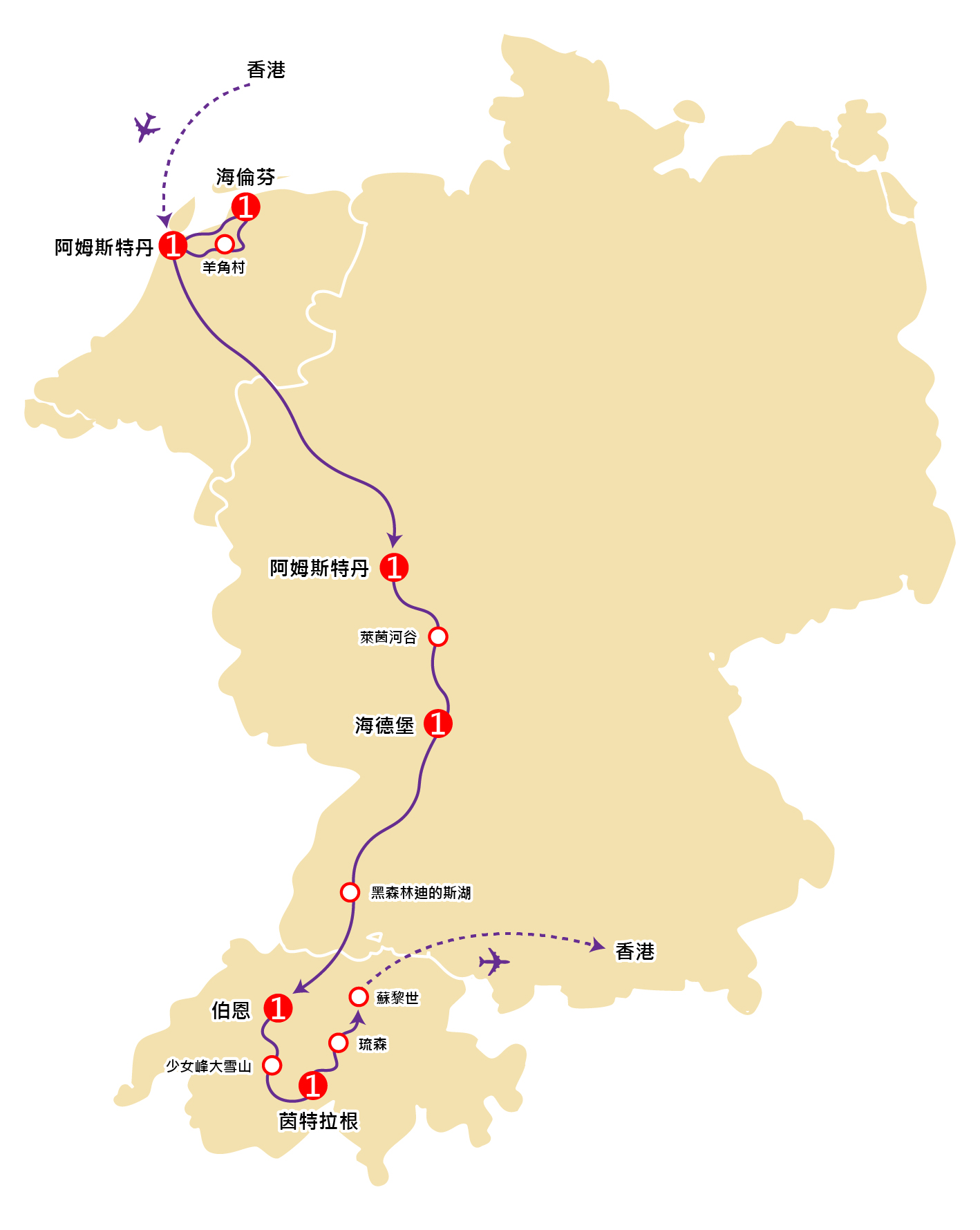 稍後於指定時間專車前往蘇黎世機場,乘坐阿聯酋航空公司客機經杜拜轉機飛返香港。航機於第8天抵達香港國際機場。