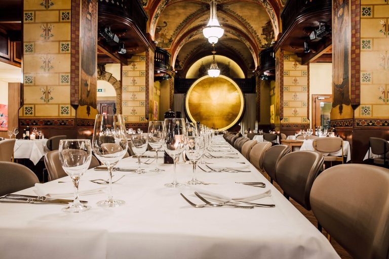 是一座建築奇蹟,也是市內最負盛名的餐廳之一。 這間餐廳坐落在一座宏偉的前穀倉內,一座宏偉的樓梯,它堪比舞會禮服,然後下到一個燈光明亮寬敞的空間散發著金色的光芒。感覺起來就像您正進入一個大宴會廳。以其令人驚嘆的壁畫和拱形天花板而聞名,營造出富裕和歷史的氛圍。