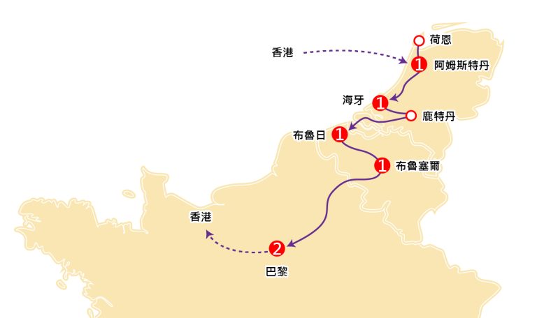 是日晚上集合於香港國際機場,由翠明假期領隊陪同下,歐洲航空公司客機經歐洲轉機飛往荷蘭首都阿姆斯特丹。