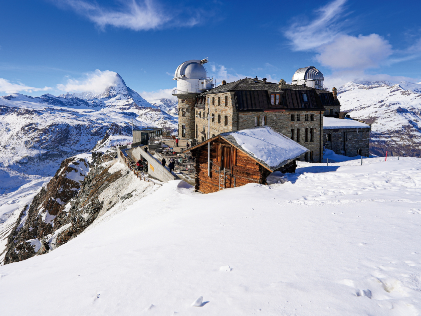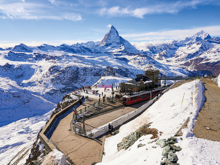 【戈爾內格拉特-大雪山美景之旅】乘火車登上海拔3090 米高之 GORNERGRAT,觀賞瑞士最著名,以「尖錐金子塔」外形見稱的馬特洪峰。馬特洪峰高 4478 米,由於外形獨特,無數廣告及宣傳皆以它為背景。此處亦可欣賞馬特洪峰及羅薩峰等38 座海拔 4000 公呎以上的山峰及阿爾卑斯山區第二大冰河~戈爾內格冰河。