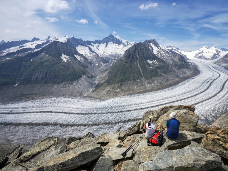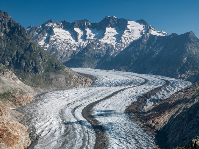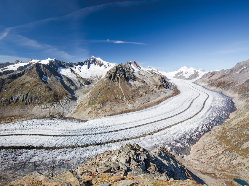 【阿萊奇冰川】乘搭吊車登山,觀賞阿萊奇冰川及鄰近美景。阿萊奇冰川全長23公里,是阿爾卑斯山脈中最長且最壯觀的冰川,其蜿蜒之姿令人嘆為觀止。團友可沿山徑拍攝美景。