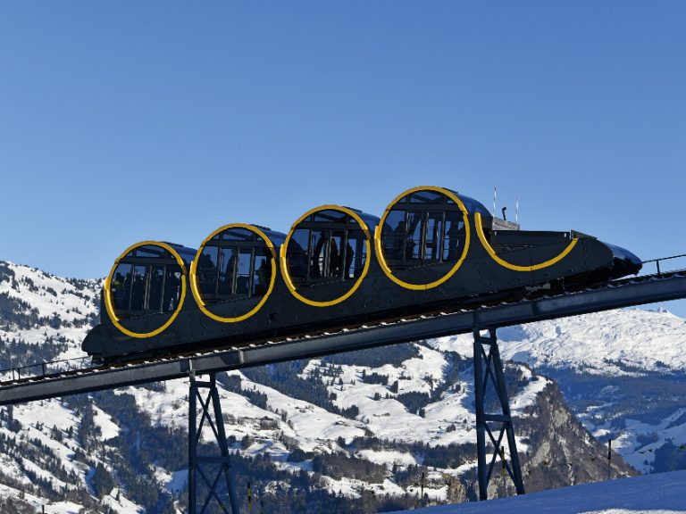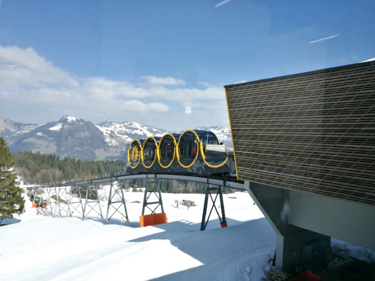 【施圖斯纜車】耗資520萬瑞士法郎,世界上最陡47.7度的纜車鐵路,獨特的車廂由四節滾筒組成,在纜車於陡坡爬升時仍能保持水平,乘客可以最佳角度欣賞沿途風景。
