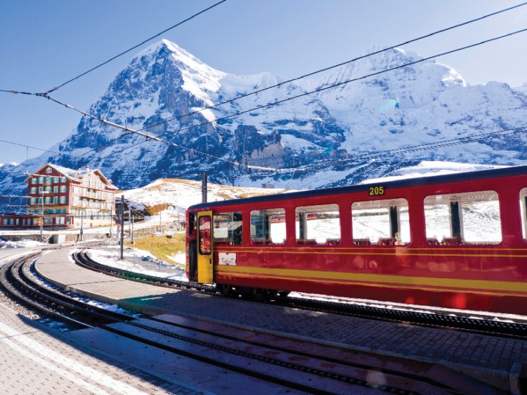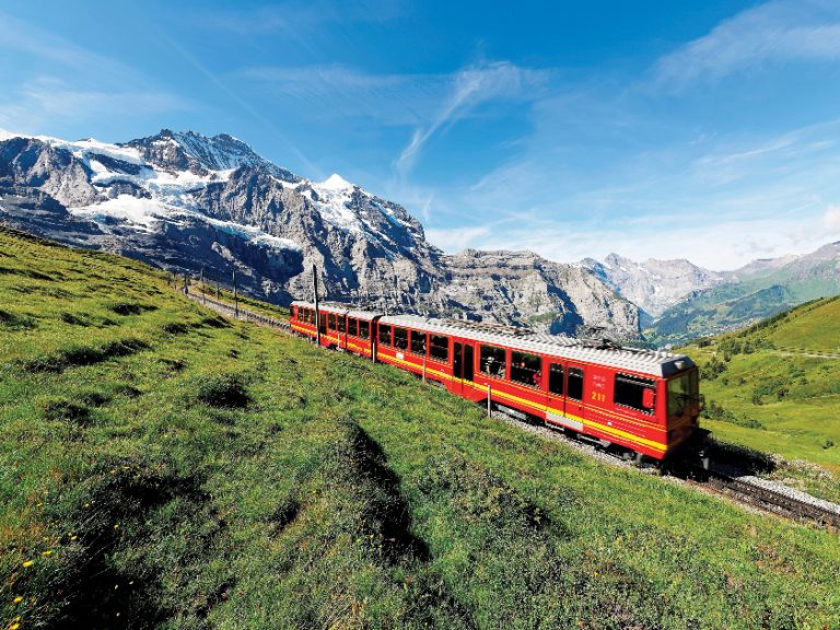乘坐最新吊車艾格快線及百年歷史齒軌火車 — 登上歐洲最高火車站。海拔11333英呎高之「歐洲屋脊」少女峰,山峰終年積雪,氣勢宏偉壯觀,於斯芬士瞭望台,觀看瑞士最大冰川 — 阿萊奇冰川,群山薈萃,美景飽覽無遺。