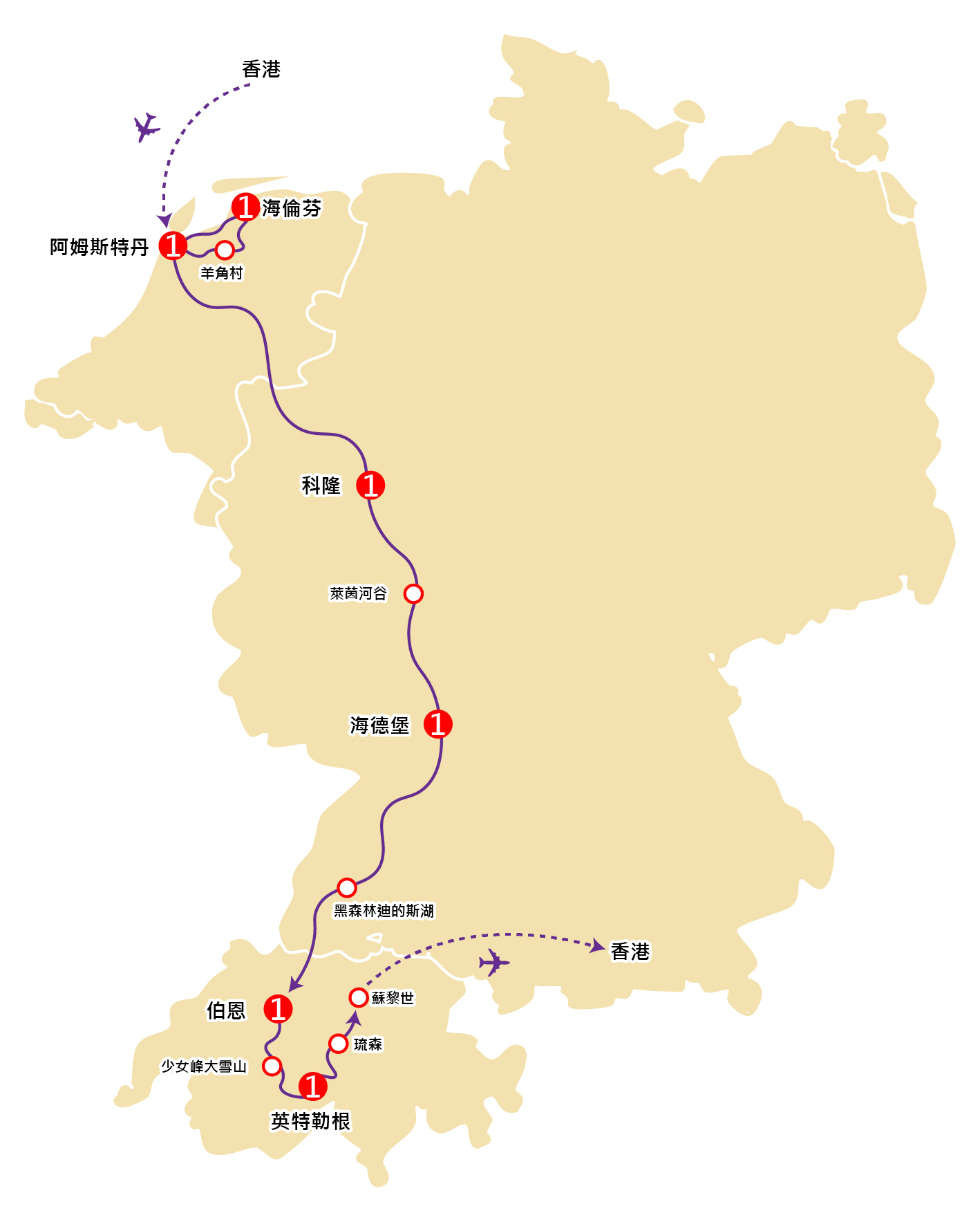 是日晚上集合於香港國際機場,由翠明假期領隊陪同下,乘坐阿聯酋航空公司客機經杜拜轉機飛往荷蘭首都阿姆斯特丹。