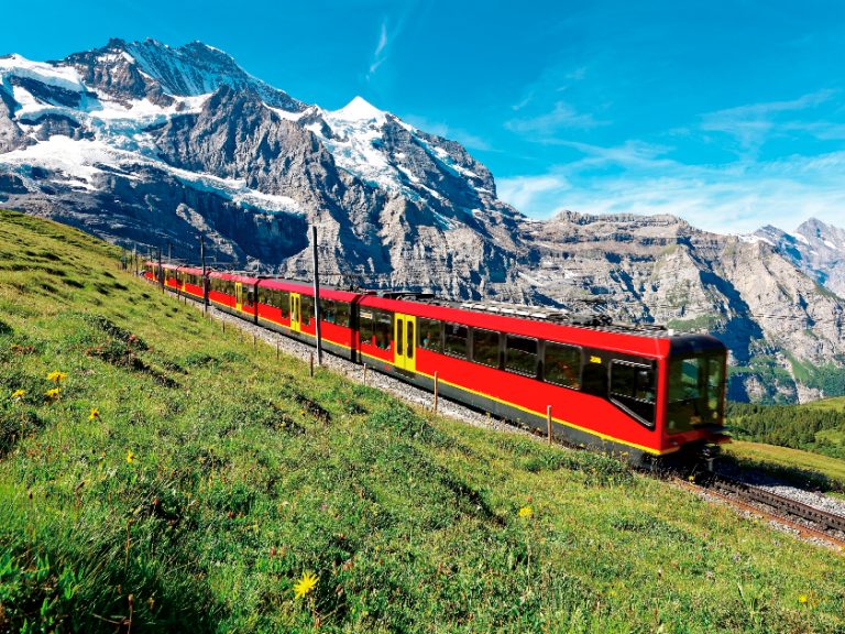 乘坐最新吊車艾格快線及百年歷史齒軌火車 — 登上歐洲最高火車站。海拔11333英呎高之「歐洲屋脊」少女峰,山峰終年積雪,氣勢宏偉壯觀,於斯芬士瞭望台,觀看瑞士最大冰川 — 阿萊奇冰川,群山薈萃,美景飽覽無遺。