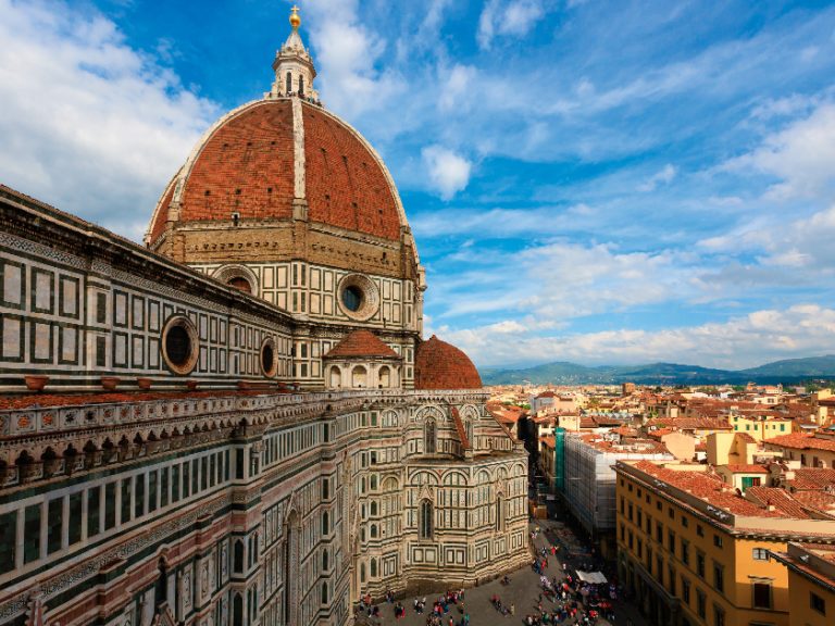 【聖母百花大教堂-門外拍照】教堂建築群由主教座堂、鐘塔與洗禮堂構成。洗禮堂其中兩扇銅門刻有《舊約》聖經故事的青銅浮雕,被稱為「天國之門」。