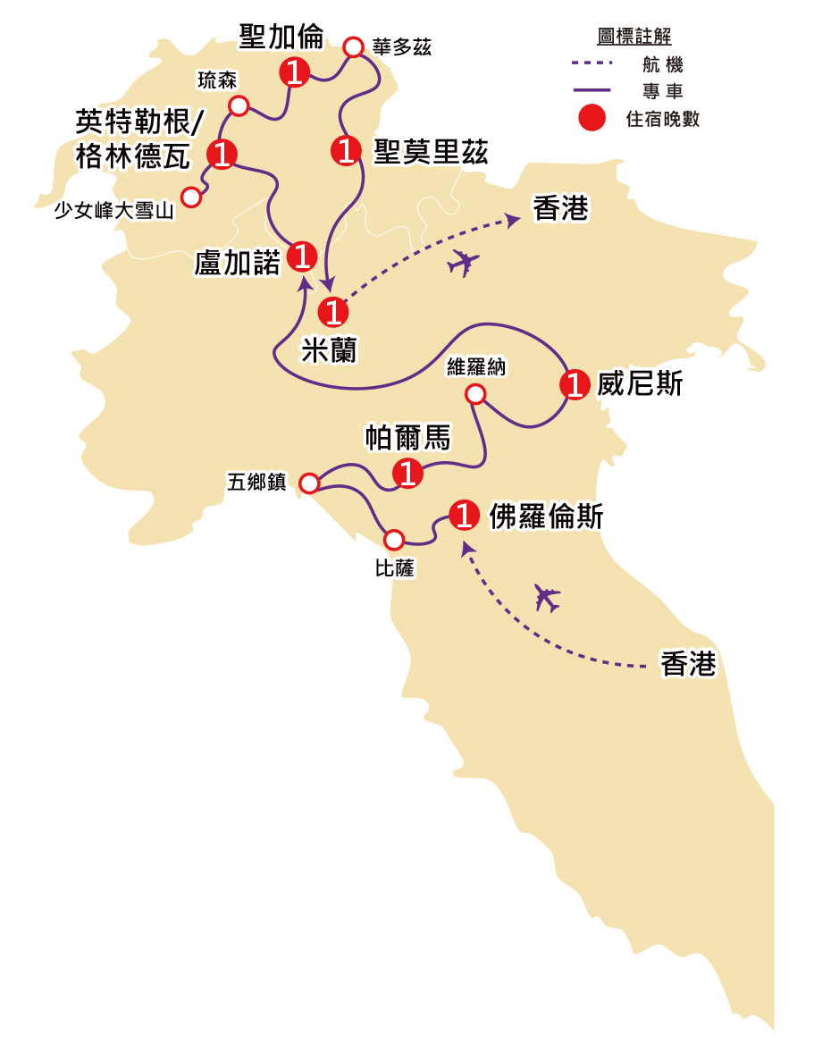 注意:如乘坐阿聯酋航空公司,將於出發日期第一天晚上集合,並於第二天凌晨航班起飛,經杜拜轉機後飛往意大利城市佛羅倫斯/波隆那。敬請留意。
