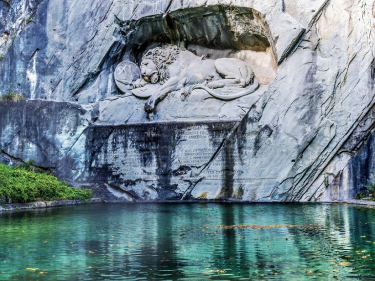【獅子紀念碑】雕塑主體是一頭身長超過10米的雄獅,它痛苦地倒臥在地,背上插著一支斷矛,表情悲壯而高貴。