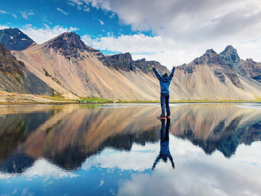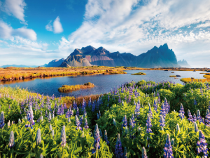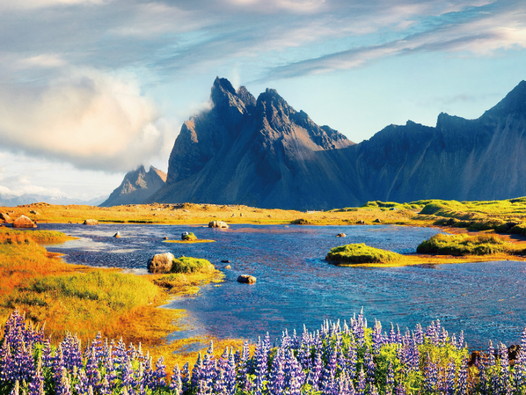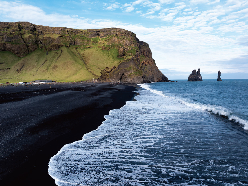 【蝙蝠山】位於冰島東南岸Vestrahorn山,是一個454米高的卵石山,主要由輝長岩(Gabbro)和花崗岩(Granophyre)組成,因為其造型被稱為「蝙蝠山」。視乎天氣情況,有機會在前方的海灘拍出山和景物的倒影,又被稱為「冰島的天空之鏡」。