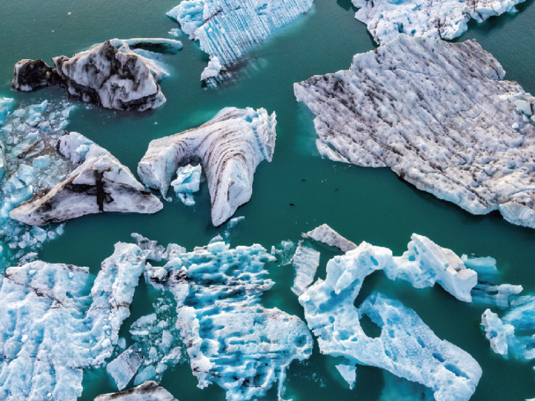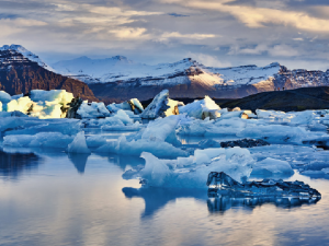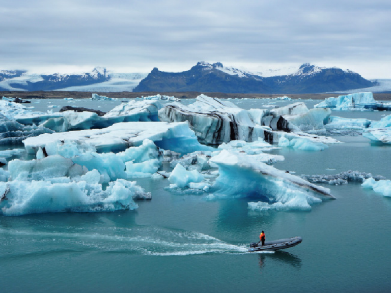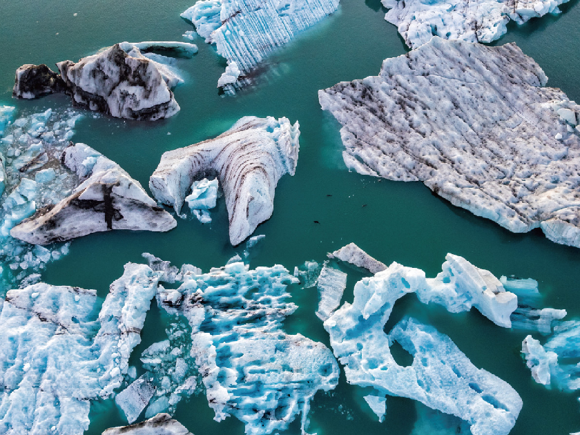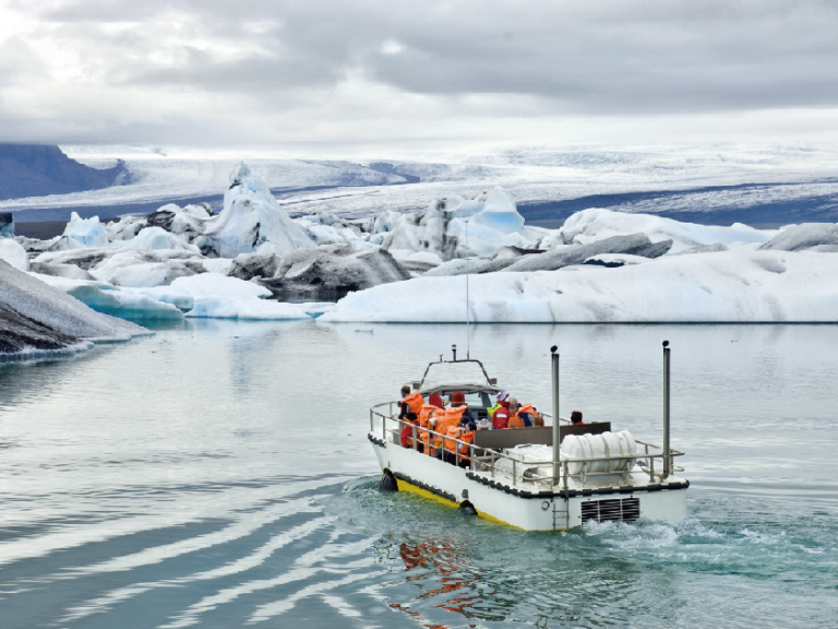【傑古沙龍冰河湖】位於瓦特納冰川(Vatnajökull)南端,是冰島上較著名的冰河湖。此湖的湖水湛藍、清澈,許多形狀各異的大型冰塊、冰帽浮於湖面,特別安排水陸兩用船光遊覽。