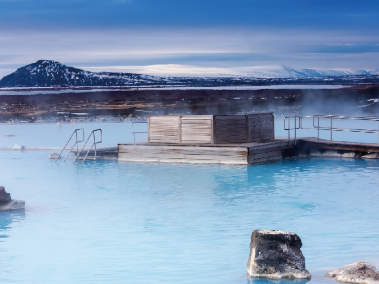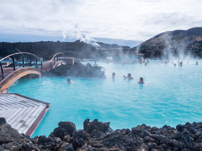 【藍湖】冰島一處著名的地熱溫泉。藍湖由部分火山熔岩形成,水溫約37-39度。湖水富含矽、硫等礦物質,是喜愛溫泉人士的天堂。(入場費及毛巾已包括在內,請自備泳衣) 並包含一杯飲品。