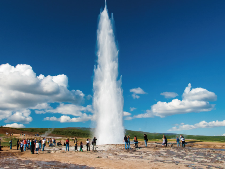 【間歇泉溫泉區】間歇噴泉每隔數分鐘就會噴出一股溫水和熱氣,激射至百尺高空,是冰島奇景之一。在溫泉區還有大小不一的噴泉和灼熱冒泡的泥窪。泥窪在地底沸騰,並放出氣泡和發出聲音。