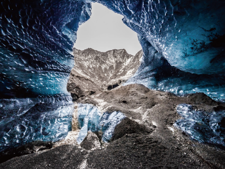 【火山黑冰洞之旅】乘坐四驅車前往黑冰洞,透明白色並散發迷人藍色光芒的冰塊,加上大量火山灰,使其顯得更加黝黑。