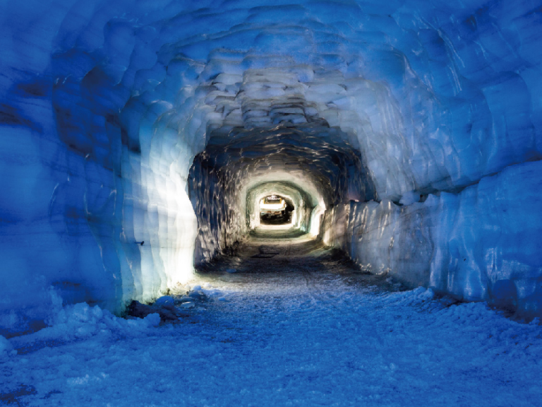 【藍冰洞】朗格冰川內建有一條長500米、深30米的冰川隧道,堪稱全球最大。漫步其中,可以欣賞數百年前形成的冰塊。這些冰塊年代越久,顏色也會由淺白逐漸轉變為深邃的藍色。