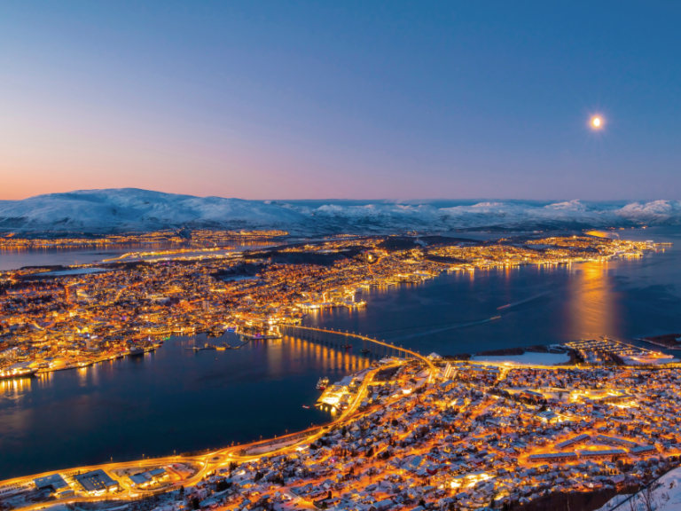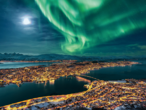 【特羅姆瑟】挪威北部最大的城市,位於高緯度北緯69.4度,有利觀賞極光,成為近年觀賞極光的熱點。因受北大西洋暖流影響,特羅姆瑟的氣候與其他同緯度的極光地區相比,更為宜人。