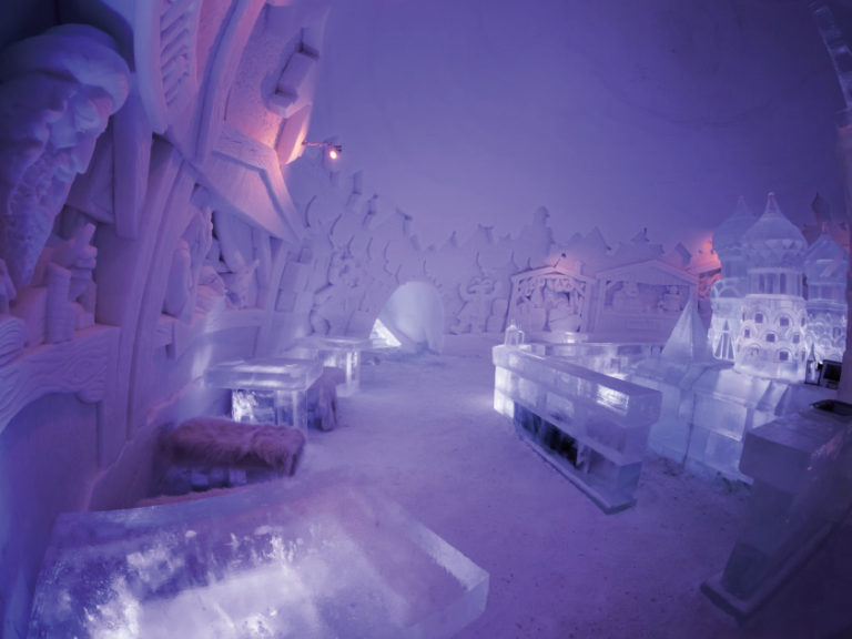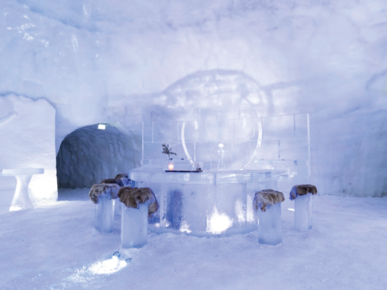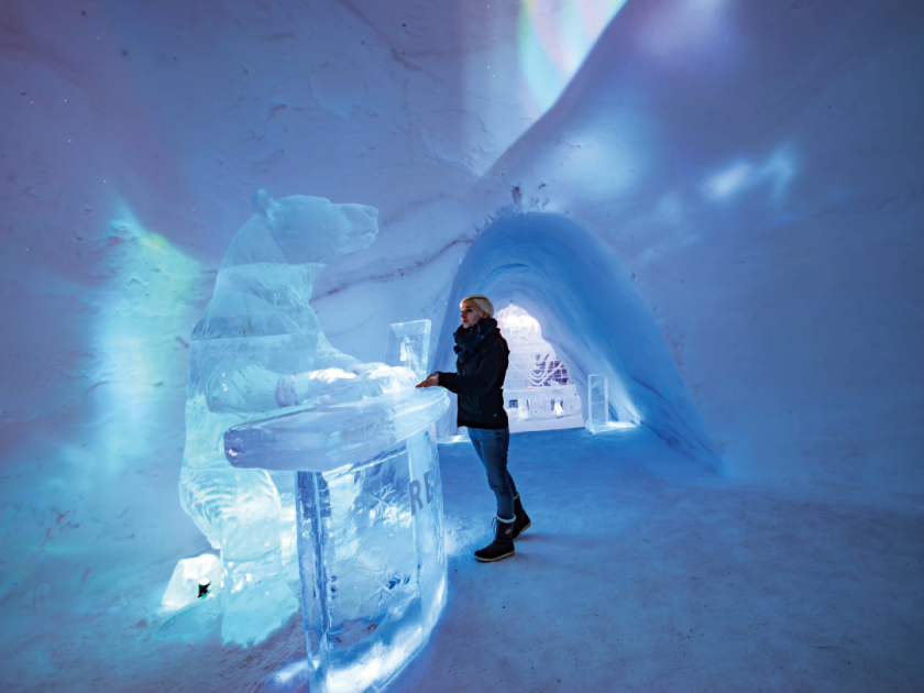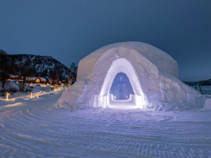 位於芬蘭的拉普蘭地區,是一個獨特的住宿體驗。提供透明的圓頂,讓客人在舒適的室內享受壯觀的北極光。遊客可以在寧靜的環境中,觀賞星空和極光。冰屋內部設施齊全,提供溫暖的床鋪和現代化的設備,讓人感受到冰雪奇境中的舒適與奢華。