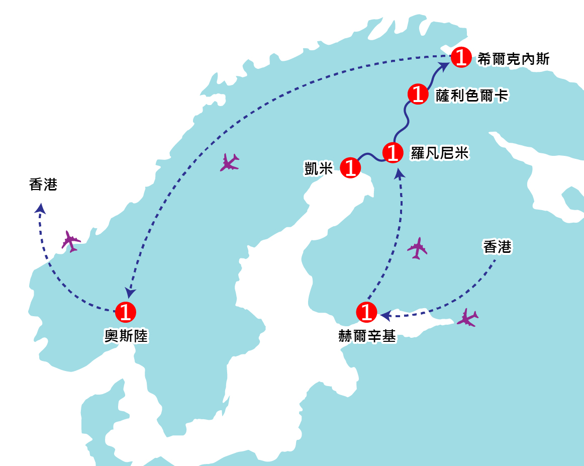 是日晚上由翠明假期領隊協助辦理一切手續後,乘坐歐洲航空公司客機經歐洲城市轉機或乘坐土耳其航空公司客機經伊斯坦堡轉機後飛往芬蘭首都赫爾辛基。