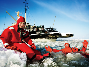 【三寶/極地探險破冰船】乘坐專業探險之破冰船,欣賞氣勢磅礡的冰海,在波斯尼亞灣北部冰封海域,轟轟衝壓冰海,震撼絕倫。在三小時行程中,包括專人介紹破冰船的運作。壓軸精彩節目,各團友可挑戰極限,穿上船上備有保暖浮水泳衣征服冰海,一嚐世界唯一的冰泳;冰泳之餘,各團友亦可步行於堅硬冰層之冰海上,滋味無窮。
