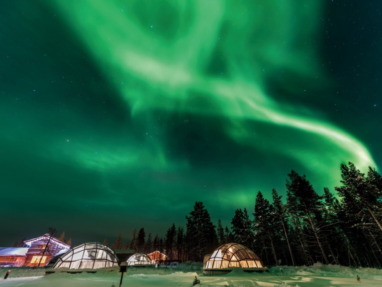 位於芬蘭的拉普蘭地區,是一個獨特的住宿體驗。提供透明的圓頂,讓客人在舒適的室內享受壯觀的北極光。遊客可以在寧靜的環境中,觀賞星空和極光。冰屋內部設施齊全,提供溫暖的床鋪和現代化的設備,讓人感受到冰雪奇境中的舒適與奢華。
