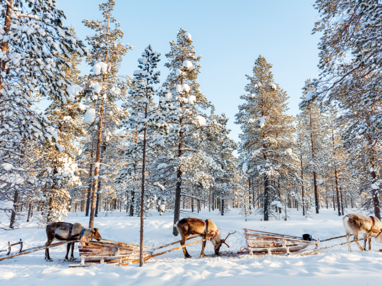 【馴鹿場-馴鹿拉雪橇】參觀馴鹿場,深入了解拉普蘭人之生活習慣以及北極圈內之馴鹿生態,更安排乘坐馴鹿拉雪橇。