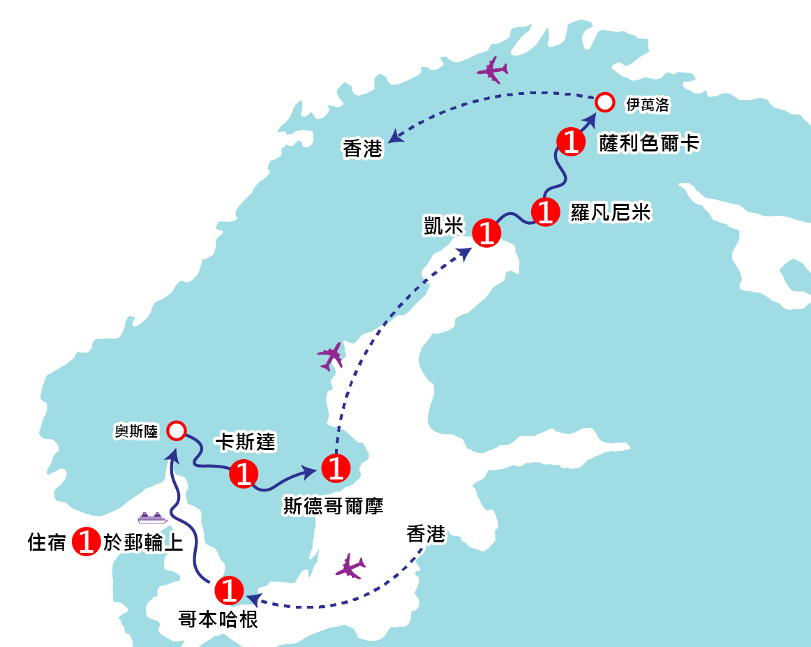 是日晚上由翠明假期領隊協助辦理一切手續後,乘坐芬蘭航空公司客機,經赫爾辛基轉機後飛往丹麥首都哥本哈根。