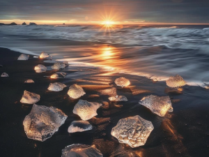 【鑽石沙灘】黑色火山沙灘上散落著從冰川崩解而來的透明冰塊,在陽光照射下閃閃發亮,宛如鑽石般點綴其上。