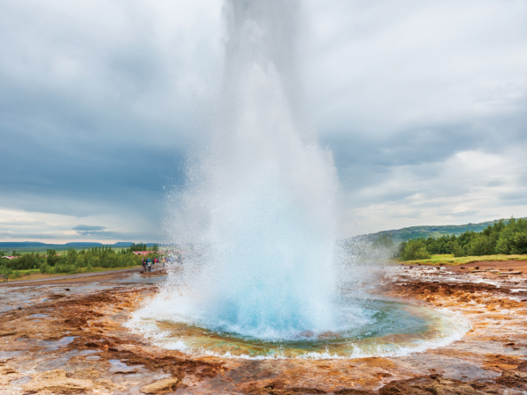 【間歇泉溫泉區】間歇噴泉每隔數分鐘便會噴發一股溫熱泉水,激射至一百呎高空,是冰島著名奇景之一。溫泉區內還有大小各異的噴泉及沸騰冒泡的泥漿窪,窪中泥漿在地底沸騰翻滾,不斷釋放氣泡並發出獨特聲響。