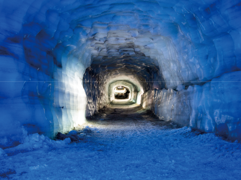 藍冰洞 ~ 朗格冰川內建有一條長500米、深30米的冰川隧道,堪稱全球最大。漫步其中,可以欣賞數百年前形成的冰塊。這些冰塊的年代愈久,顏色也由淺白逐漸轉變為深邃的藍色。