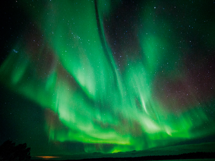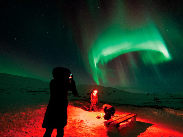 【黑夜追蹤北極光】黑夜中乘坐專車前往極光觀賞營,追蹤如夢似幻的北極光,由專人解說北極光的傳說與資料。在溫暖營火會中享用熱飲及小吃。