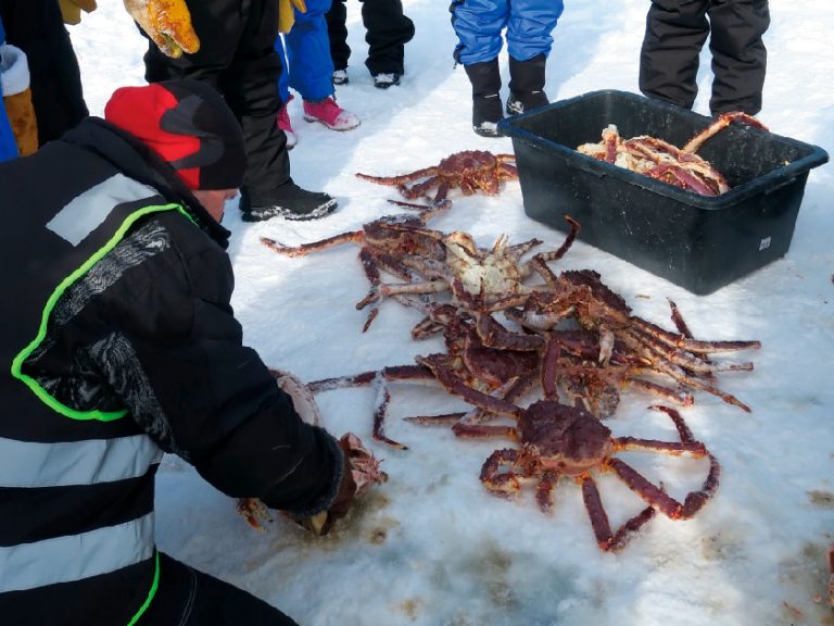 【捕捉帝王蟹】生長在挪威北部深海之下800至1000米的帝王蟹,因其碩大肥美、綠色無污染而深受人們喜愛。跟隨探險專業人士一起乘坐由雪地摩托拉動的雪橇前往打撈帝王蟹活動,在冰地挖鑿的冰洞,將捕蟹籠從洞內拉出後,乘坐雪橇返回,並品嚐肉質鮮美的帝王蟹。
