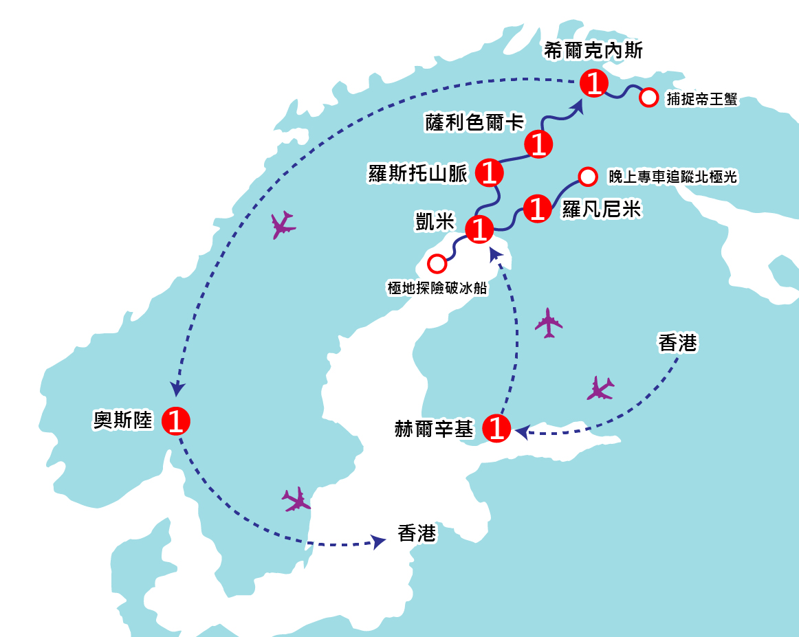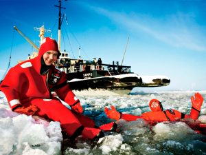 【三寶/極地探險破冰船】乘坐專業探險之破冰船,欣賞氣勢磅礡的冰海,在波斯尼亞灣北部冰封海域,轟轟衝壓冰海,震撼絕倫。在三小時行程中,包括專人介紹破冰船的運作。壓軸精彩節目,各團友可挑戰極限,穿上船上備有保暖浮水泳衣征服冰海,一嚐世界唯一的冰泳,冰泳之餘各團友亦可步行於堅硬冰層之冰海上。