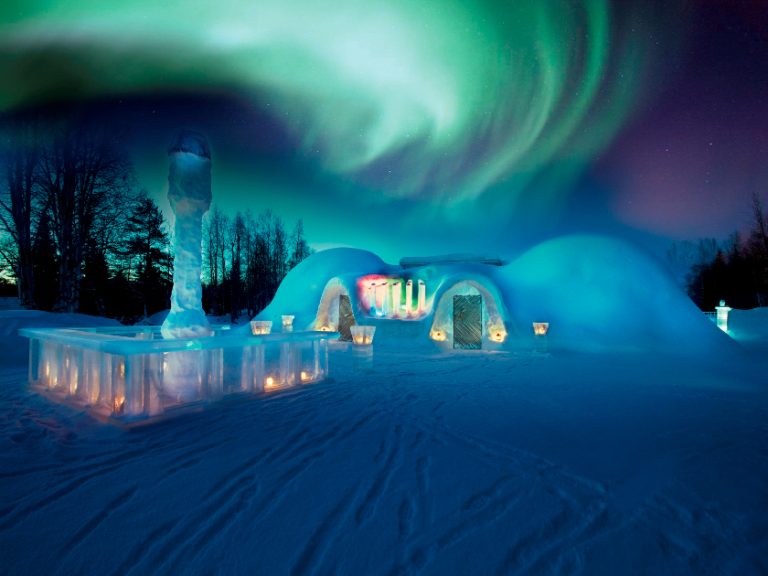 位於芬蘭的拉普蘭地區,是一個獨特的住宿體驗。提供透明的圓頂,讓客人在舒適的室內享受壯觀的北極光。遊客可以在寧靜的環境中,觀賞星空和極光。冰屋內部設施齊全,提供溫暖的床鋪和現代化的設備,讓人感受到冰雪奇境中的舒適與奢華。
