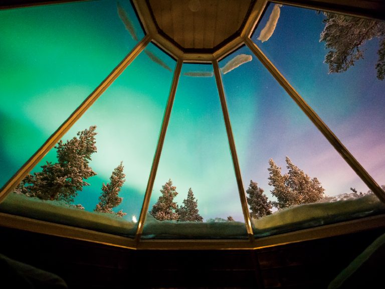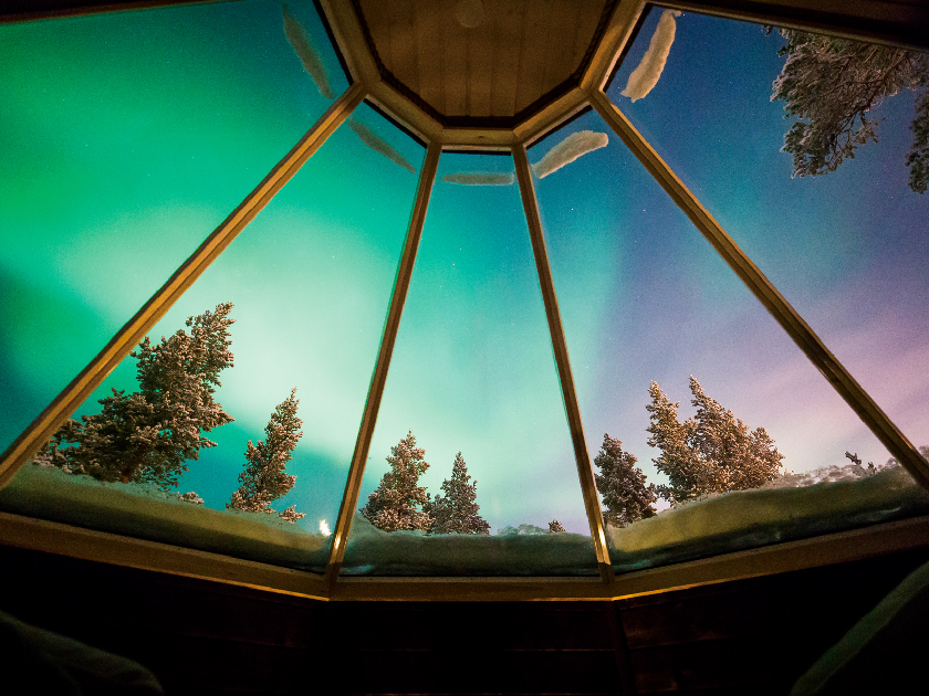 【玻璃屋酒店】躺臥在玻璃屋內,欣賞廣闊夜空,感受寒冬的奧秘。在黑夜中,更可追蹤如夢似幻、可遇不可求的北極光(AURORA BOREALIS),找尋祥和的信念。