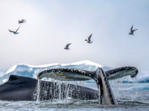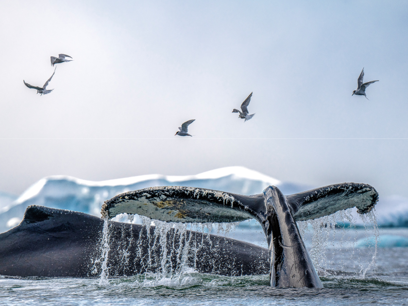 南極海域常見的鯨魚種類包括:座頭鯨(Humpback Whale)、殺人鯨(Killer Whale)、小鬚鯨(Minke Whale)、長鬚鯨(Fin Whale)及藍鯨(Blue Whale)。其中體型最龐大的藍鯨,成年體長可達約33公尺,體重可達180公噸,是地球上現存最大的動物。