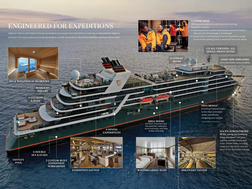「Seabourn Pursuit 南極追夢號」甫於2023年完工下水,斥資超過2億美元建造,是目前極地探險郵輪中最新、最奢華、噸位最大(23,000噸)的船隻。值得一提的是,追夢號擁有目前最新技術,可派出衝鋒艇以「聲納科技」偵測航路,並即時將資訊回傳至郵輪上,除確保航行安全順暢外,還可讓船隻最靠近景點、旅客可以最近距離觀察生態,完美結合「奢華」與「探險」的旅行體驗。