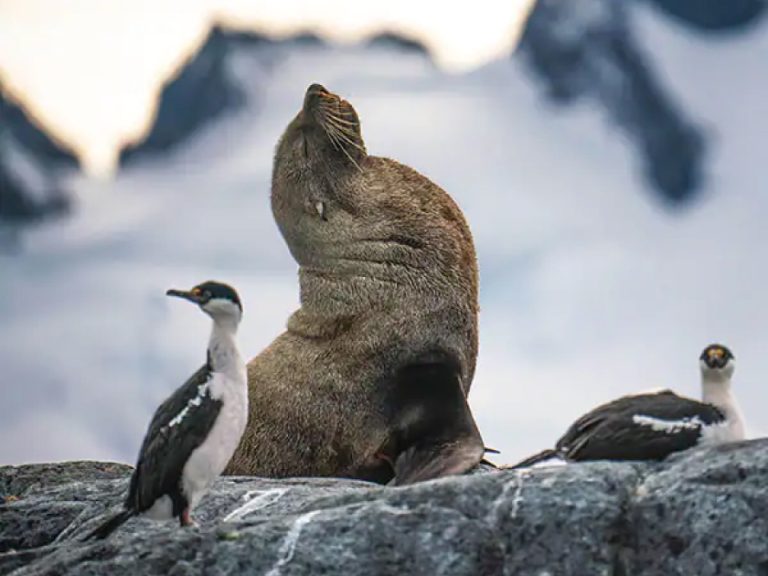 南極洲最常見的企鵝共有5種:巴布亞企鵝(Gentoo Penguin)、長冠企鵝(Macaroni Penguin)、帽帶企鵝(Chinstrap Penguin)、皇帝企鵝(Emperor Penguin)及阿德利企鵝(Adelie Penguin)。這些企鵝均以群體方式活動,旅客可在岸上近距離觀察不同種類的企鵝群體,欣賞滿山遍野的企鵝進行追逐、哺育幼雛、築巢等各種有趣行為,更有機會目睹海豹慵懶躺臥、翻滾的可愛姿態。