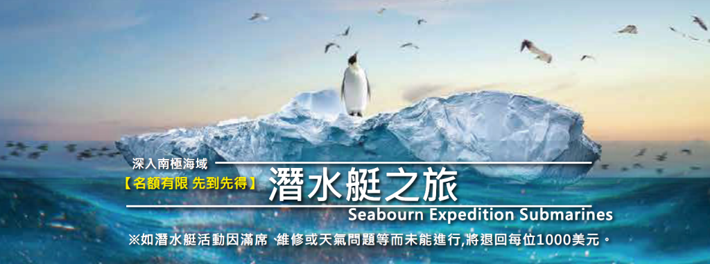 「潛水艇之旅」郵輪配備客製化潛水艇,可搭載7人(連駕駛員)。下潛至水下300公尺,所有視野不受干擾,將親眼目睹南極水下奇觀。