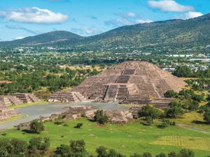 【提奧狄華岡】世界文化遺產之一,是阿茲特克古老文明遺跡。建於公元100年,提奧狄華岡意即「眾神居所」,建築規劃嚴謹,中心主軸為死亡大道,東邊是祭祀中心的太陽和月亮金字塔及羽蛇神殿,象徵神造天地人的故事,也寄寓居民對神的尊敬與期望。在墨西哥城內幾乎絕跡的仙人掌,在遺跡附近卻隨處可見。