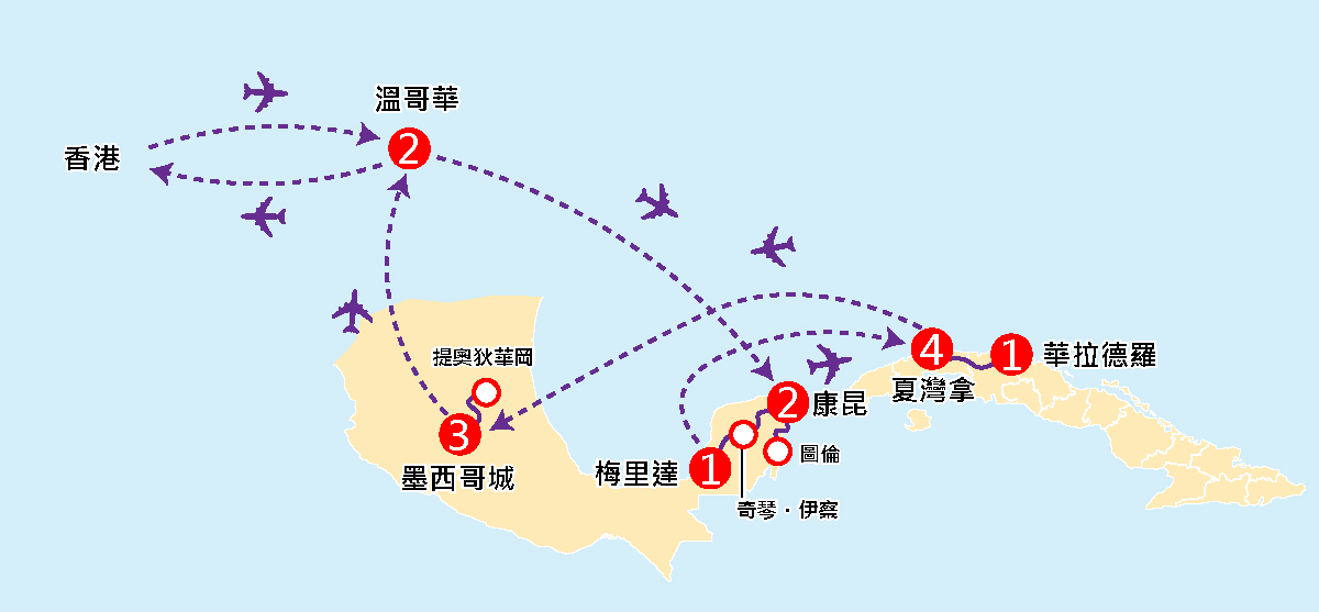 早上前往機場,乘坐加拿大航空公司客機飛往國際級海濱度假天堂康昆,展開陽光海灘和瑪雅文化探秘之旅。由於機程及時差關係,抵達及辦妥入境手續後,乘專車前往酒店休息及享用晚餐。