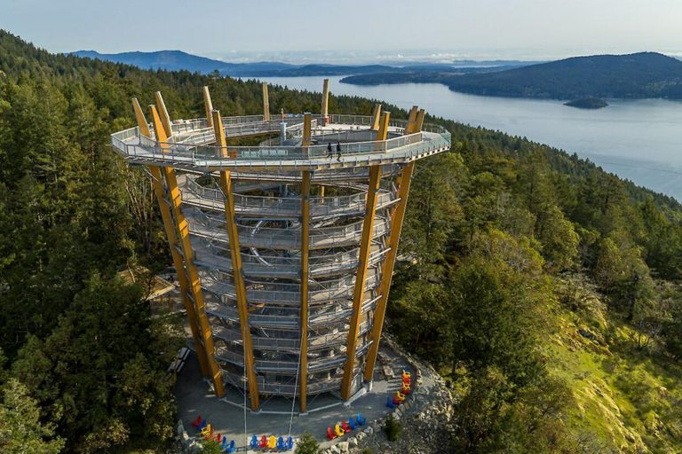 •前往溫哥華島《新景點》-瑪拉哈特天空步道 MalahatSkywalk,坐落在 Cowichan 山谷的邊緣。訪客們在此親近大自然、深入感受 BC 省沿海地區獨特的天然景觀。登頂的途中有多個觀景點,離地 20 米的TreeWalk,近距離欣賞楊梅樹和道格拉斯杉樹。登上 10 層高的螺旋塔式觀景台,可以 360 度欣賞卑詩省和華盛頓州海岸山脈景色,一覽無遺。回地面時,還可選擇從驚險刺激的螺旋滑梯滑下,新奇有趣。