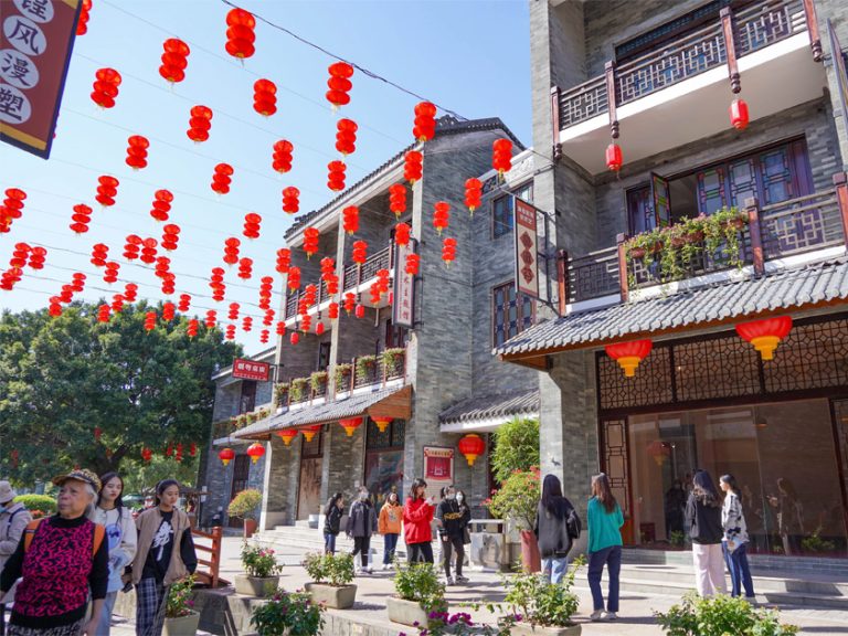 【嶺南印象園】位於廣州大學城南部,這裏復原了傳統嶺南村落,鑊耳牆、蠔殼牆、趟櫳門、青磚瓦房等特色建築栩栩如生。園內常態化表演醒獅、粵劇、廣東音樂,還有廣繡、木雕、欖核雕等非遺體驗。漫步青雲巷、古祠堂,品嚐地道嶺南小吃,感受昔日鄉村繁華。