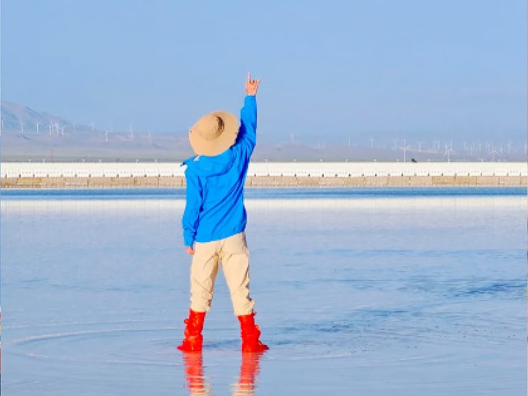 ② 穿大紅鞋套拍「天空之鏡」倒影